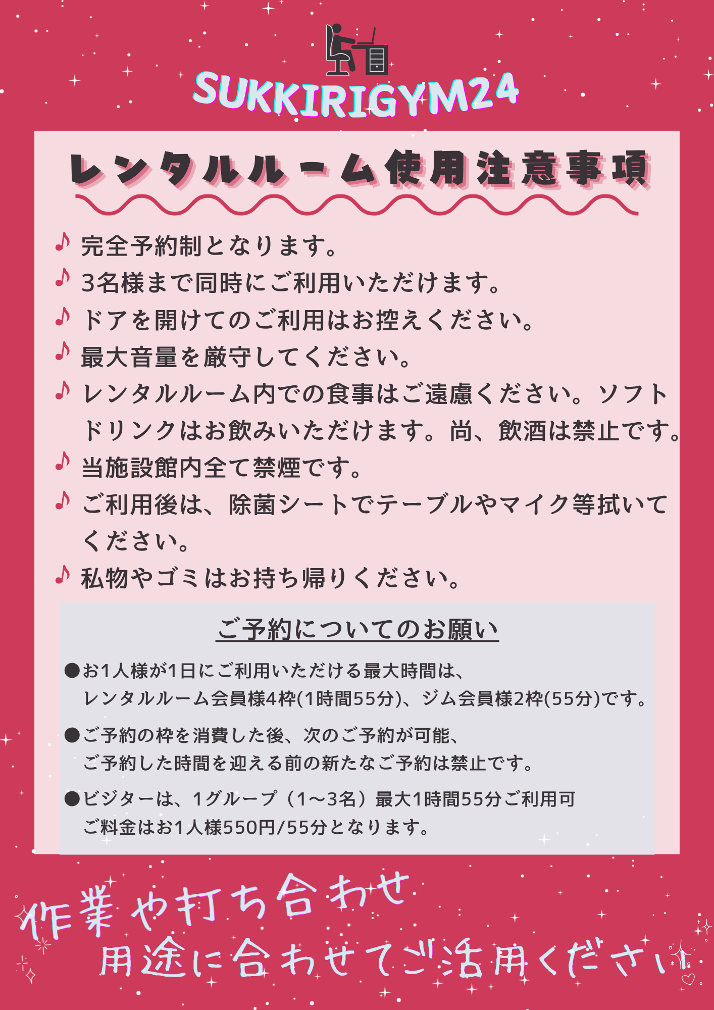 レンタルルーム会員になれば、月額2,980円で毎日レンタルルームをご利用いただけます。